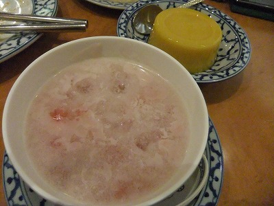 デザートは暖かいココナッツシロップにクワイの実が入ってます。