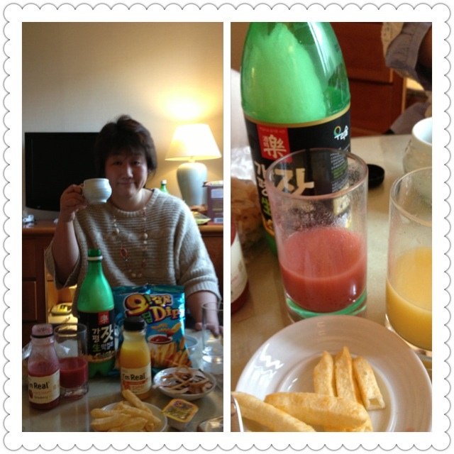 ロッテマートで買ってきたマッコリとリアルのジュースで割ってマッコリジュースで朝ごはん(^_−)−☆