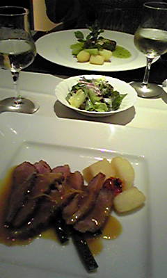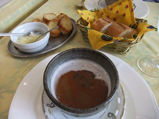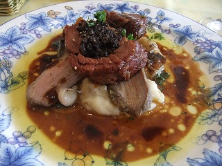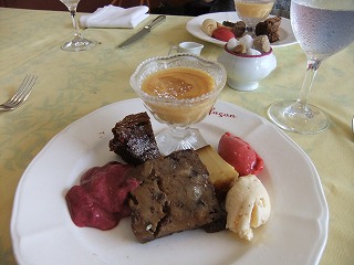 お魚のスープにはチーズとフランスパンをひたして頂きました。 メインは羊ちゃん。 煮込んでてホロホロ~だったり、ソテーしててジューシーだったり、なすにミンチを挟んでいるのでとろけちゃうや~っん、てな3種類の違った食感を堪能しました。デザート盛り合わせはカシスシャーベット、焼きプリンや桃のつるんとしたもの他。 どれも美味しかったデスが、印象的だったのはバニラアイスの中に胡椒が入ってて後味がピリリとするもの。 面白かった~