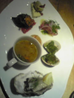 前菜は枝豆のムース、オレンジ色はガスパチョ、手前の黄色は長葱の蜂蜜煮、紅イモ。
