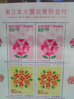 2つの銀行の後に郵便局に行って80円切手を買おうとしたら「可能であれば震災寄付金付の切手があるので1枚でもいいのでどうですか??? お願います!!!!」と物凄くアピールされたため、「あ・・・じゃそれで良いです」とシートで買ってきました。