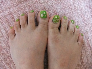 余りにも枝豆みたいで美味しそう過ぎるグリーンだったので、☆のシールをいっぱい付けてもらっちゃいました^^ かなりお気に入り^^ お手手は派手にしたかったので豪華にキラキラにしてもらいましたよ。スパローちゃんありがとう