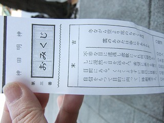 神田明神で、古いお守りを返して新しいお守りを買ってお財布にしまいました。 お正月からの懸案事項だったのでようやく新しいお守りに替えられてホッとしました。 いつも”みのり”という満願成就のお守り一辺倒の私なのですが、今年は可愛いのもいいかな~と桃のお守りに手を伸ばしたのです。 よく見たら”安産”だって(おいおい)。 気持ちを切り替えてコレも結構可愛いじゃん^^ と手に取ったら”ペット用”でした(涙)。 結局今年も”みのり”です。 ええ、満願成就ですからね~ 期待してますよ(フンだ!) 。最後におみくじ引いたら末吉でした。 残念過ぎて速攻で木に結わいてきちゃいました。
