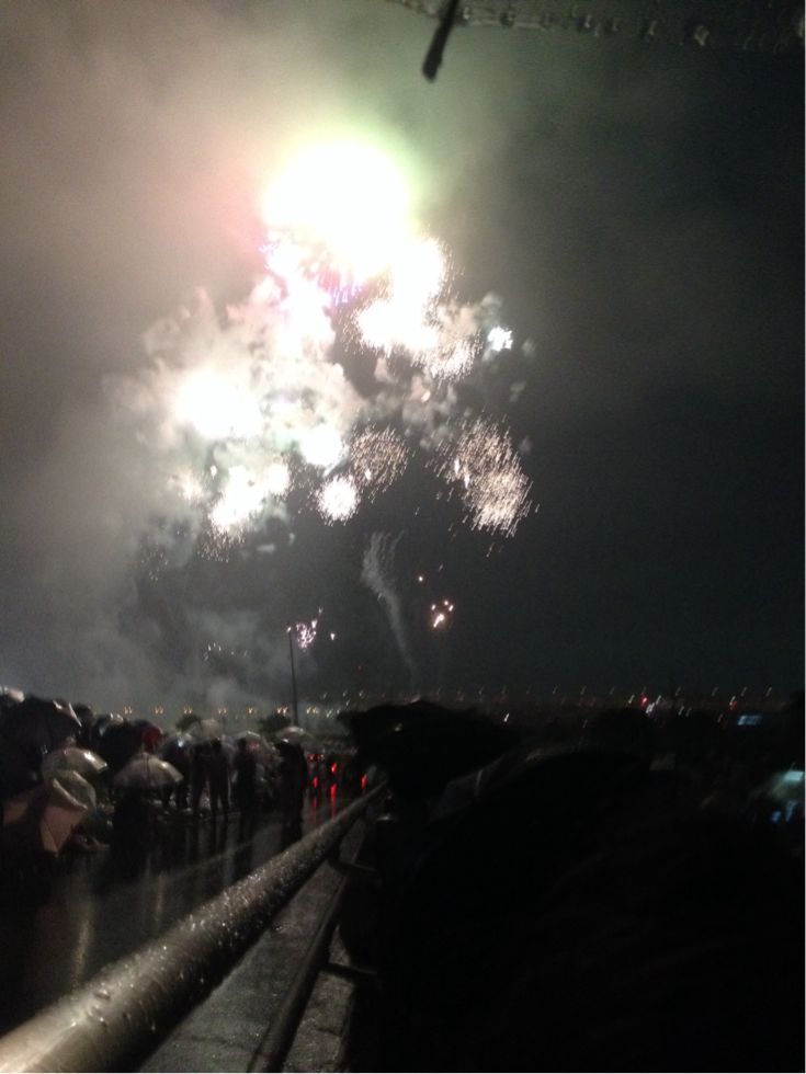 打ち上げスタート19時半の為、18時過ぎに土手に向かいシートなんかを敷いてワクワクしてたらチョー雨。ゲリラ豪雨かよ〜的なめっさ雨で合羽着てた私さえも濡れ鼠。着ていた服の色が変わった頃には妙なテンションで…ヤバイ楽しくなってきちゃった^_−☆ 写真にも傘の人写ってますよね(笑)。