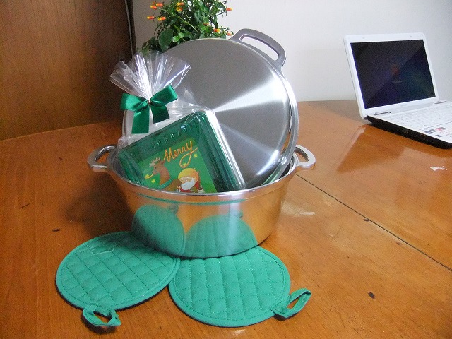 イゲちゃんからは「無水鍋」です。 水が要らないお鍋なんですって。 この光り輝く鍋が黒光りするくらい頑張って美味しいものつくるね♪ 近々に食べに来てくだされ(笑)。