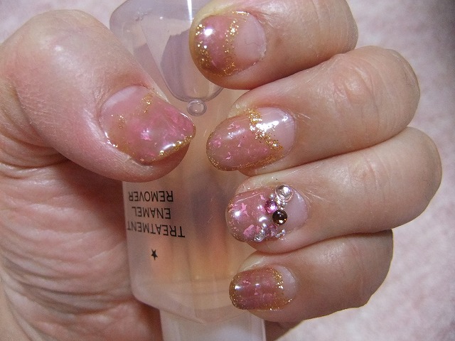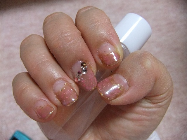 もうね、痛くて痛くてれいちゃんにSOS出したらすぐにうちに来てくれて、割れた爪をくっつけてくれました^^ 今回はベースのベージュの上にピンクの絵の具を散らしてくれて・・・この組み合わせだけでも充分キュートなのに、更にゴールドで縁取りまでしてもらっちゃいました