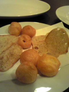 先ずは白ワインのグラスを一杯。 お通しみたいな感じででてきたのがコレ。 フランスパンのお煎餅みたいなやつと丸いのはチーズの練りこんだシュークリームのシューみたいもので、フランスでは有名な食べ物らしいです。