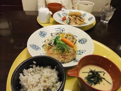 でもって、ヨドバシカメラの8階にある安全・安心・健康 さんるーむで自然食風なディナーしてきました。 私はレンコンのハンバーグ。 七穀米、とろろ、マンゴープリン+バナナアイス、珈琲が付いて1480円でした。 お酒を飲まない外食、久しぶりだわ(笑)。 結構美味しかったしゆっくりできたし良いお店ですね^^