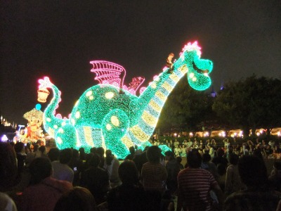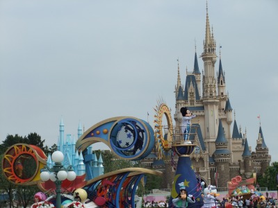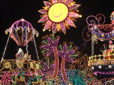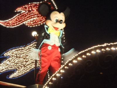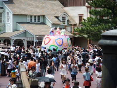 外に出るとパレード『ジュビレーション』が! ヅカファン的にはちょっと気になるタイトルなのよね(笑)。 思わず懐かしい『ジュビレーション』の歌を歌って踊ってみたり。 嗚呼、夢の王国は何でもアリだな(笑)。 それでもパレードの近くに行くほどの気力のない我々は遠くから眺めることに・・・harumiなんて目を瞑ってぐったりしてる。 近くに同じようにくたびれ果てているパパさんもいた。 サラリーマンの悲哀を感じた瞬間だな(嘘)。