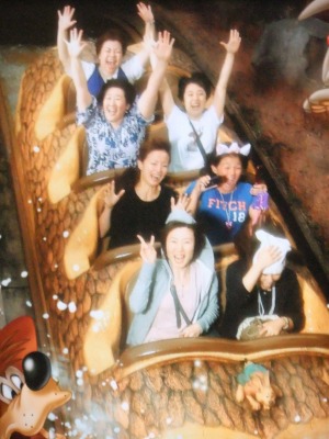 15時。ファストパスで『フプラッシュ・マウンテン』に乗りました。 普通に並ぶと120分くらいでしたね。根性悪いんですけど”優越感”を感じずにはいられない(笑)。 ずんずんとファストパス用の列を通って行くのですが、私には暗くて見えないのよ。 余りの恐さにスーピーちゃんに「春琴抄ごっこ」をしながら乗り場まで手を引いてもらいました(笑)。 そしてミッション! 「両手を挙げて笑顔を作れ!」。 みんな両手は挙げられたけど笑顔がね~ 芸術点を加味してharumiが1番に落ち着きました。
