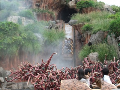 腹ごなしにトゥーンタウンをふらふらして、その後『イッツアスモールワールド』、20分待ちになっている『ホーンデットマンション』へ。 このアトラクションは私ひとりで乗ったので、暗くて涼しいので少しだけ目を瞑って寝たり、足をマッサージしたりしながらの数分間を過ごしました。 幽霊のいたずらで止まっている時間も長かったしね(笑)。
