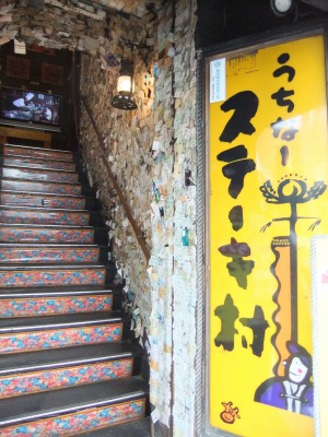 先ずは腹ごなし! 「ニク~ お肉が食べたい!!!」と大騒ぎしてステーキ屋さんを探し、その中でピンときたうちなーステーキ村さんに入りました。 来客者名刺がオカシイ位に貼ってある階段に「この時代にこんなにも個人情報をおおっぴらにしてて如何なものか」との不安を覚えつつ扉を開けてみました。時間的にもお客さんが1組いただけでかなり静か。 しかしスタッフさんは愛想がいいし、目の前でお肉を焼いてくれるパフォーマンスも面白かったし、何よりお肉が柔らかくて美味しいししボリュームたっぷりだしで大満足でした。 派手なお店が多すぎてナカナカ目に留まりにくいかも知れないけれどかなりお勧めできますよ、このお店^^