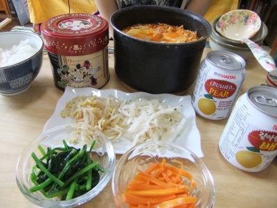 今日はささやかにeiryちゃんの壮行会を開催^^ メインのスンドゥブチゲとナムルを作ってみました。 ナムルは初めて作ったし、雰囲気で味付けしたし、朝作ったばかりなので味が落ち着いてないしと言い訳だらけですが、それっぽくは出来たかな(笑)。 おろしニンニクが決め手なのは実感しました(笑)。 野菜をたっぷり取れる常備食として今後はマメに作ってみようかな~と思います^^