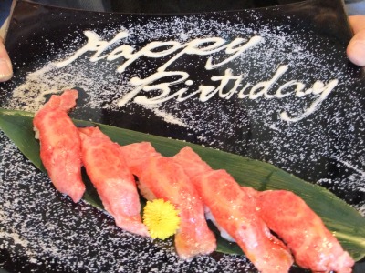 冷麺はり付けは可愛くていいけど、お味は普通かな。麺が違えばもっといいかもだね。 和牛にぎり寿司はこのお店に決めたときから「食べたい」と思っていた一品なんですよね。 薄めにカットされ、口の中でとろけるような生肉に甘めのタレがついてるんですよ(至福の瞬間)。 そうそう、このHappyBirthdayの文字はホワイトチョコで周りの白い粉はお塩なんですよ(笑)。可愛いでしょ^^